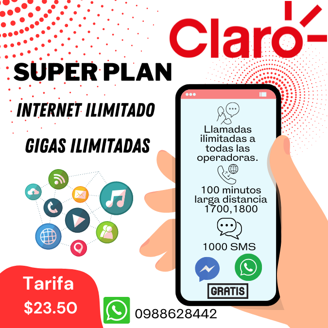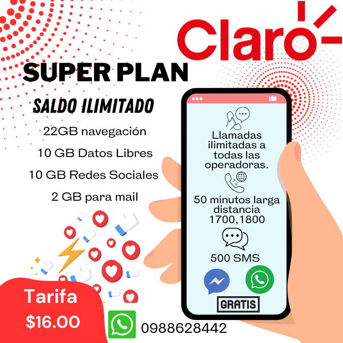 ¡Descubre la revolución en comunicación con nuestro servicio de internet telefónico Super Plan! Con la cobertura de Claro, la mejor del Ecuador, disfrutarás de 22 gigas de navegación, 10 gigas de datos libres, 10 gigas en redes sociales y 2 gigas para correos electrónicos. Mantente conectado en todo momento y exprime al máximo tu experiencia digital. ¡La libertad de comunicarte está en tus manos!📱🌐📨